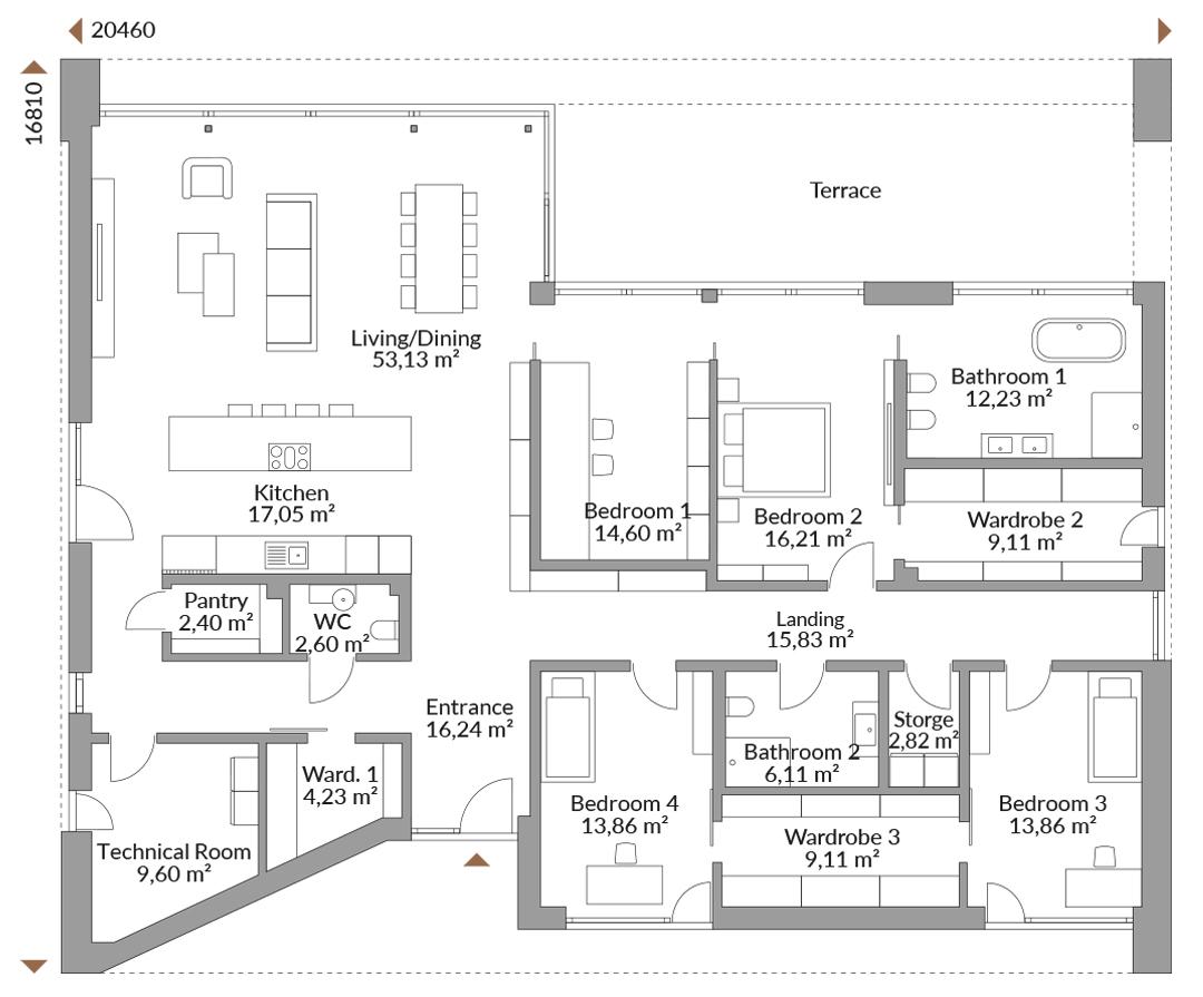 This beautiful bungalow offers 220 square metres of ground-level living with room-high windows for fantastic daylight and transparency. The architecture features large-format facade panels and a sheltered terrace making a clear and structured statement.
