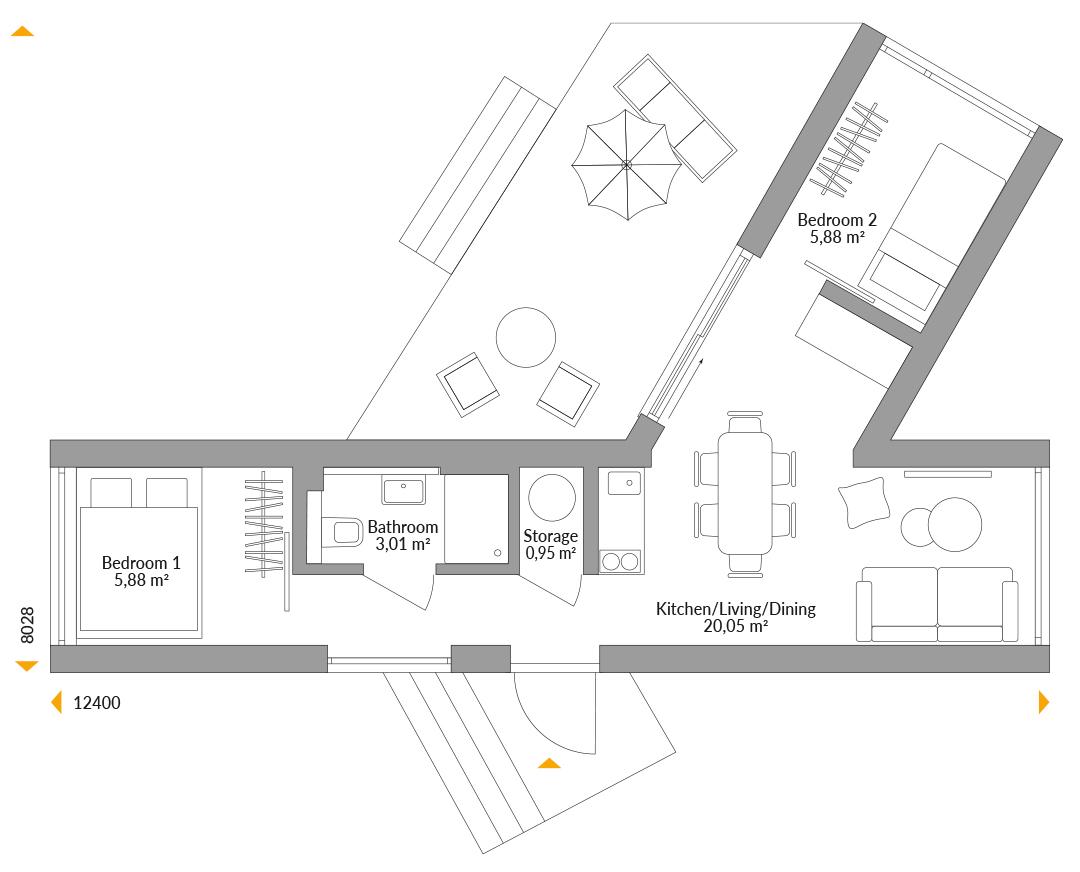 Got a bigger group? The beauty of modular houses is that if you need extra rooms you can add them, especially if it’s a second bedroom and an additional large wardrobe, because for four people – or even a maximum of six – you need a bit more living and storage space. And despite the narrow S modules, there is still space for a large table where you can eat and play together. The addition of the side wing also provides a wind-protected terrace space, a permanent fixture and just like having a sunroom.